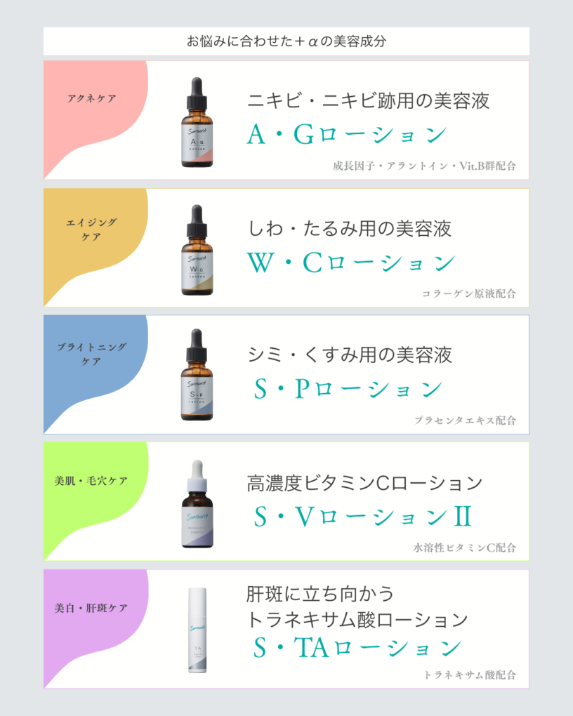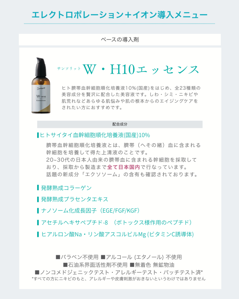 導入する成分も厳選された成分を使用。国産のヒトサイタイ血幹細胞順化培養液など23種類の美容成分を含むW・H10エッセンスをベースに、お悩みに合わせた美容液を5種類の中から選択していただけます。